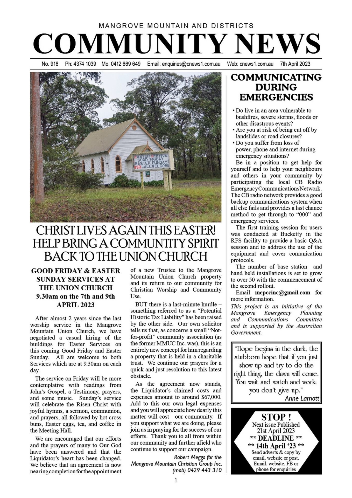 CN918 April 7, 2023 CN918 pdf download CN918 flipbook view Mangrove Mountain & Districts Community News – Issue 918 Posted in Past Issues, Past publications