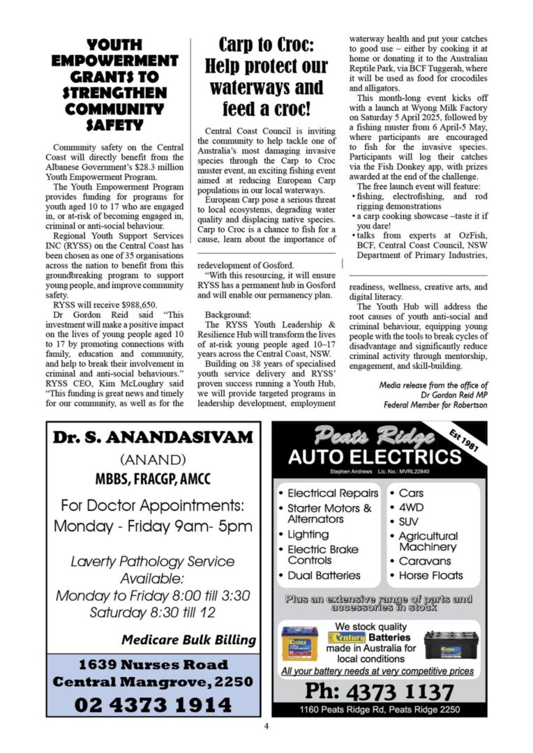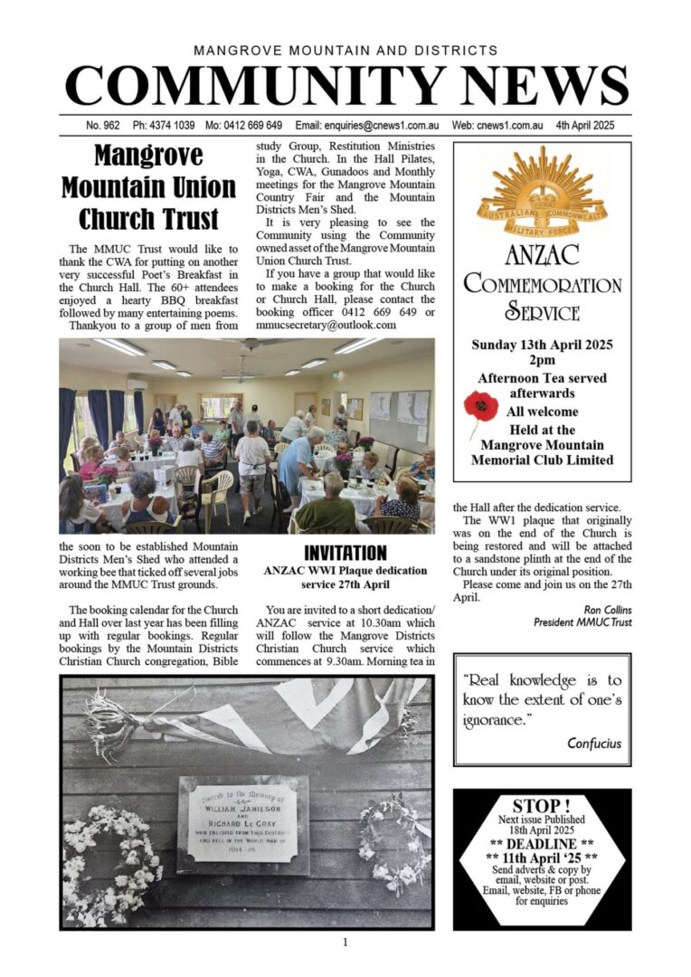 CN962 April 4, 2025 CN962 pdf download CN962 flipbook view Mangrove Mountain & Districts Community News – Issue 962 Posted in Past Issues, Past publications