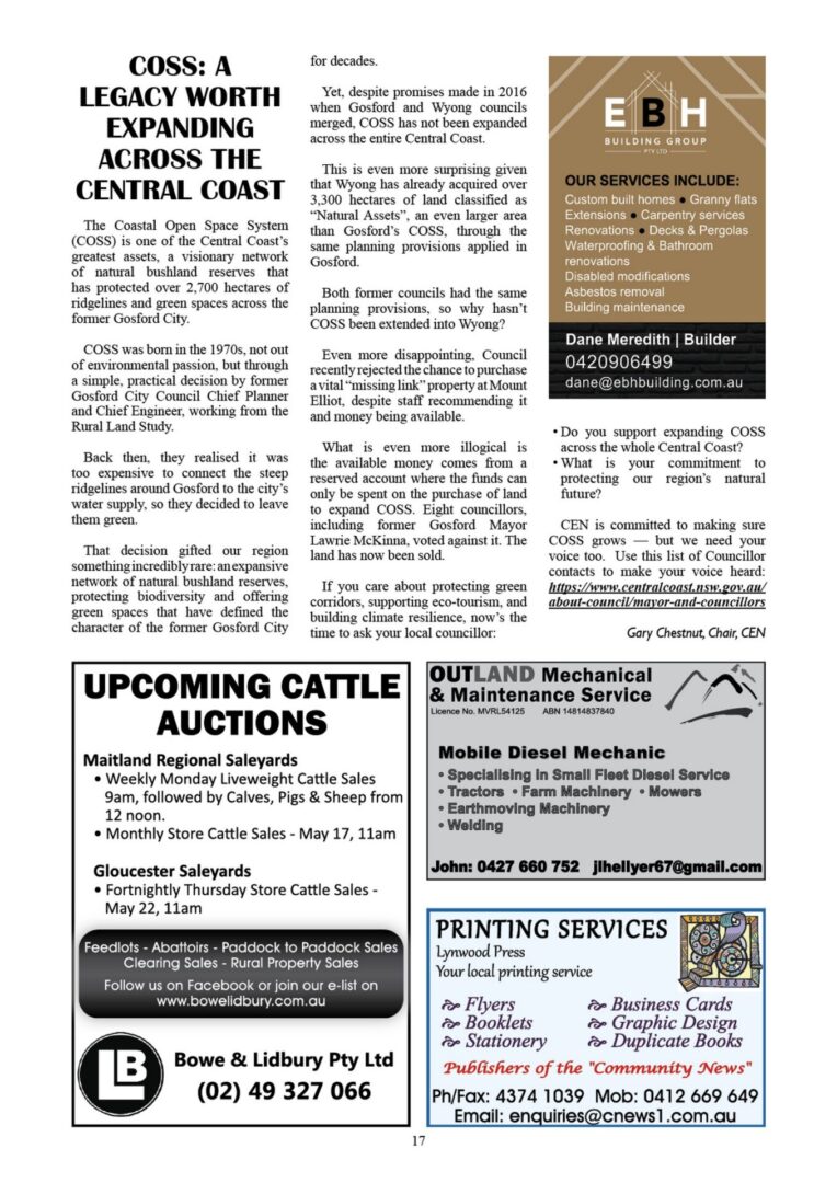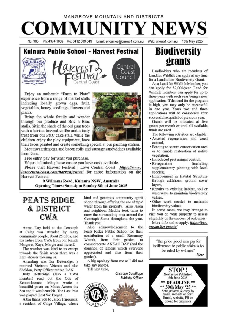 CN965 May 16, 2025 CN965 pdf download CN965 flipbook view Mangrove Mountain & Districts Community News – Issue 965 Posted in Past Issues, Past publications