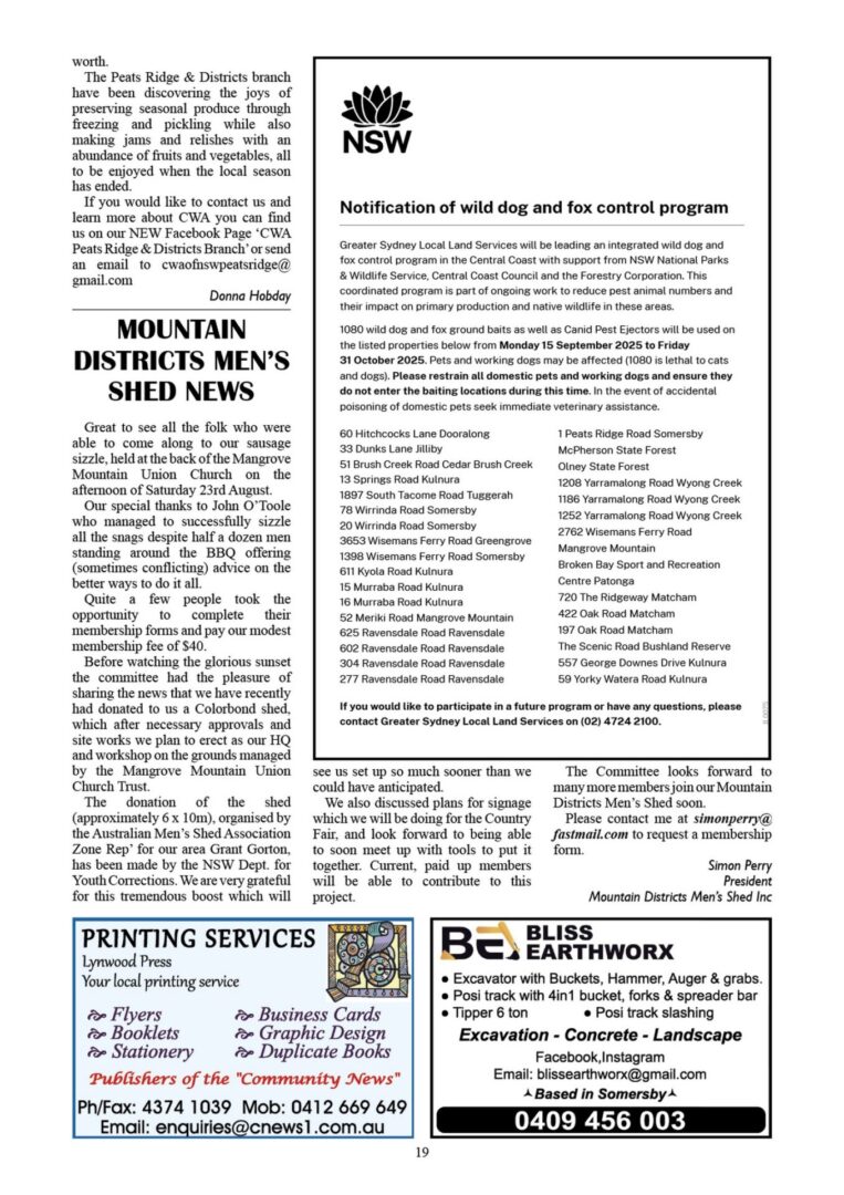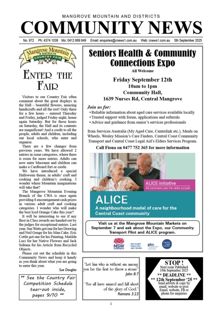 CN972 September 5, 2025 | 0 CN972 pdf download CN972 flipbook view Mangrove Mountain & Districts Community News – Issue 972 Posted in Past Issues, Past publications