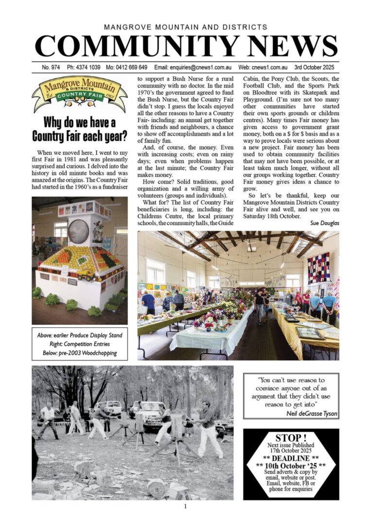 CN974 October 3, 2025 CN974 pdf download CN974 flipbook view Mangrove Mountain & Districts Community News – Issue 974 Posted in Past Issues, Past publications