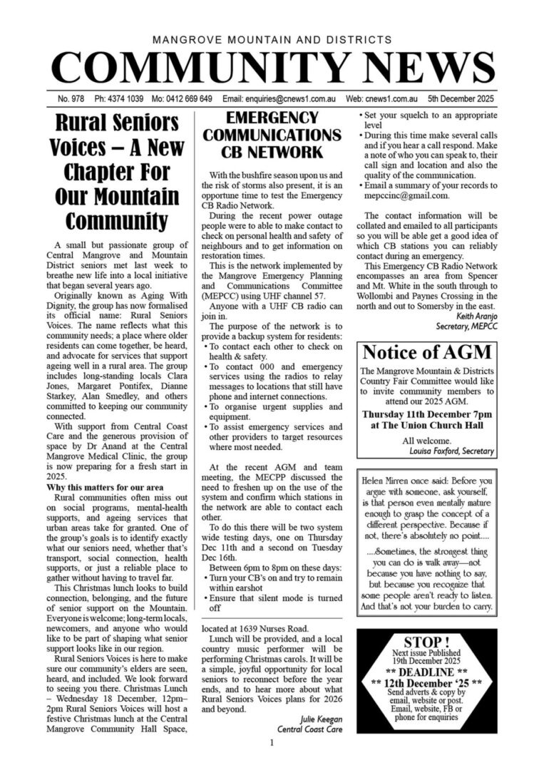 CN978 December 5, 2025 | 0 CN978 pdf download CN978 flipbook view Mangrove Mountain & Districts Community News – Issue 978 Posted in Past Issues, Past publications