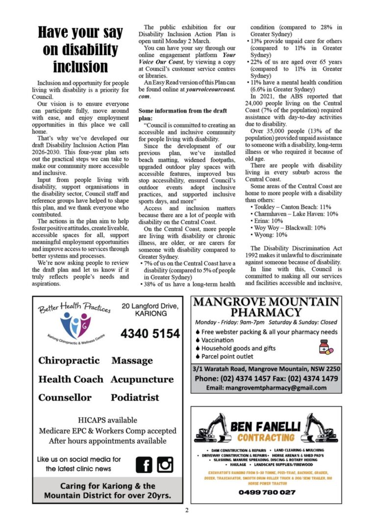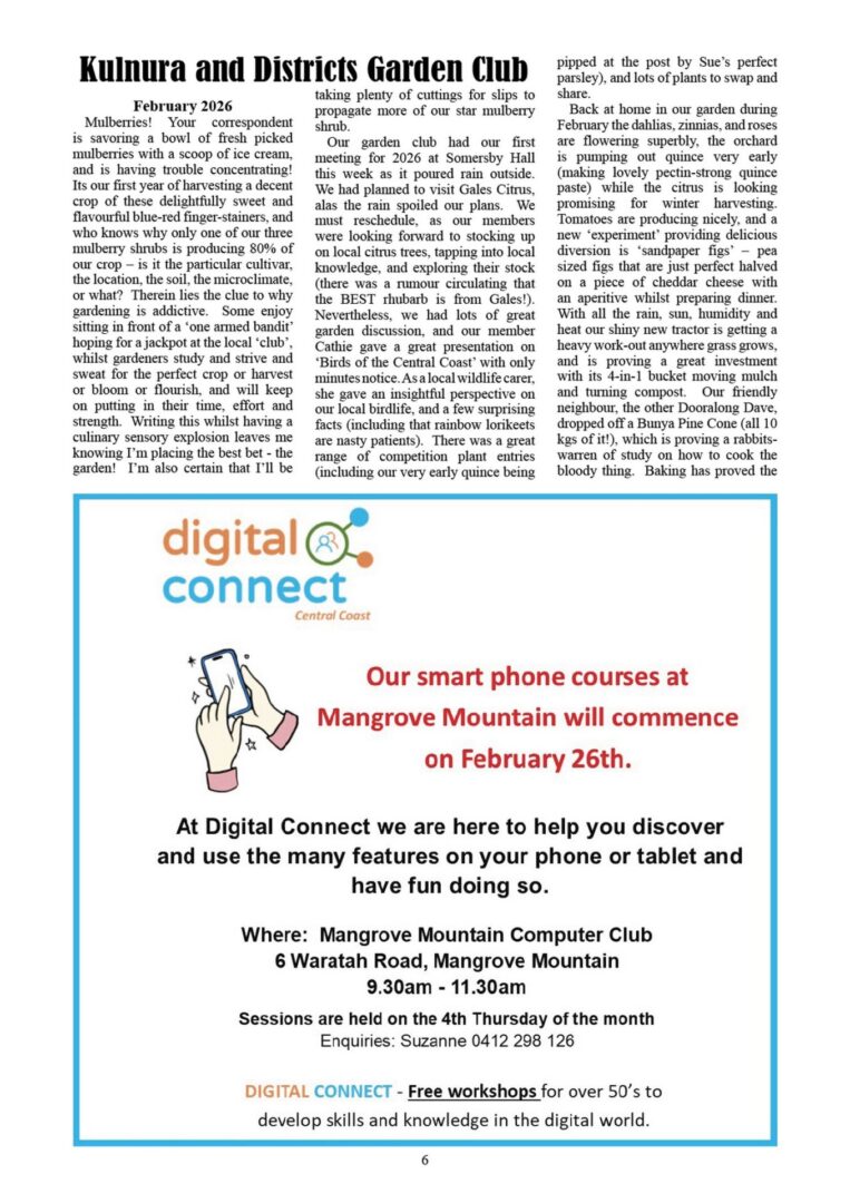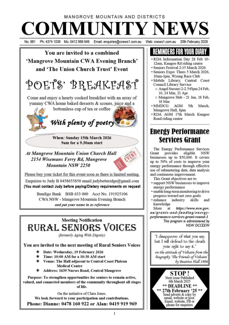 CN981 February 20, 2026 | 0 CN879 pdf download CN981 flipbook view Mangrove Mountain & Districts Community News – Issue 981 Posted in Past Issues, Past publications